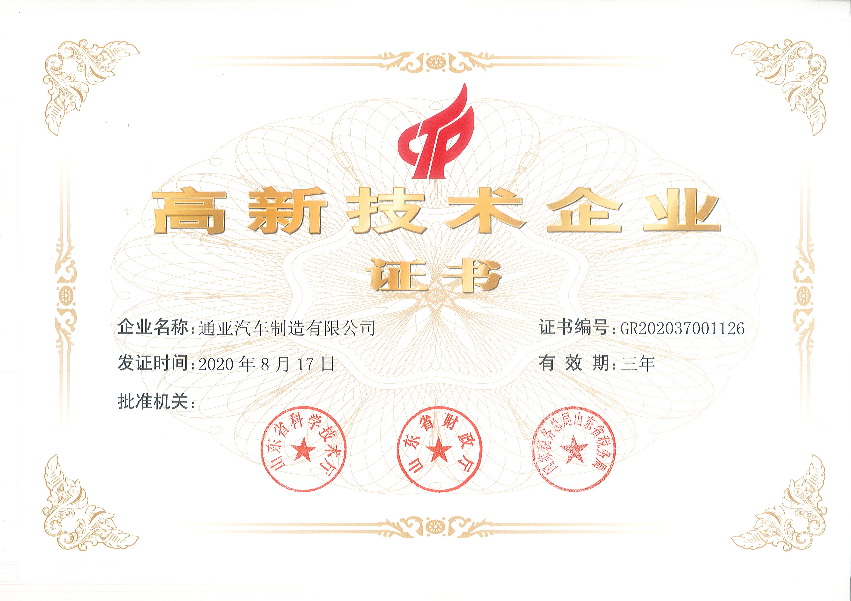 国家级高新企业证书